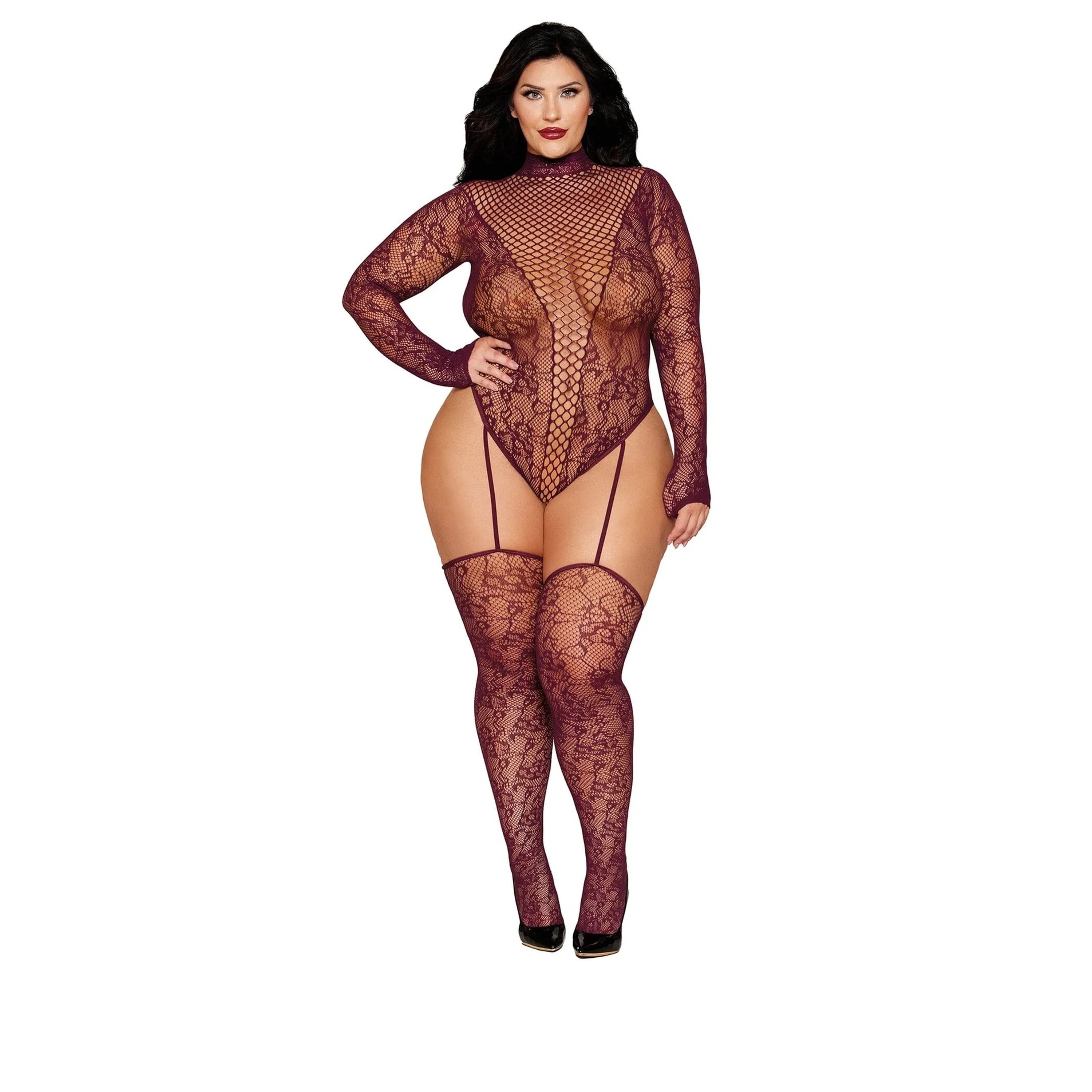 • High-leg teddy with attached elastic garters and matching thigh high stockings