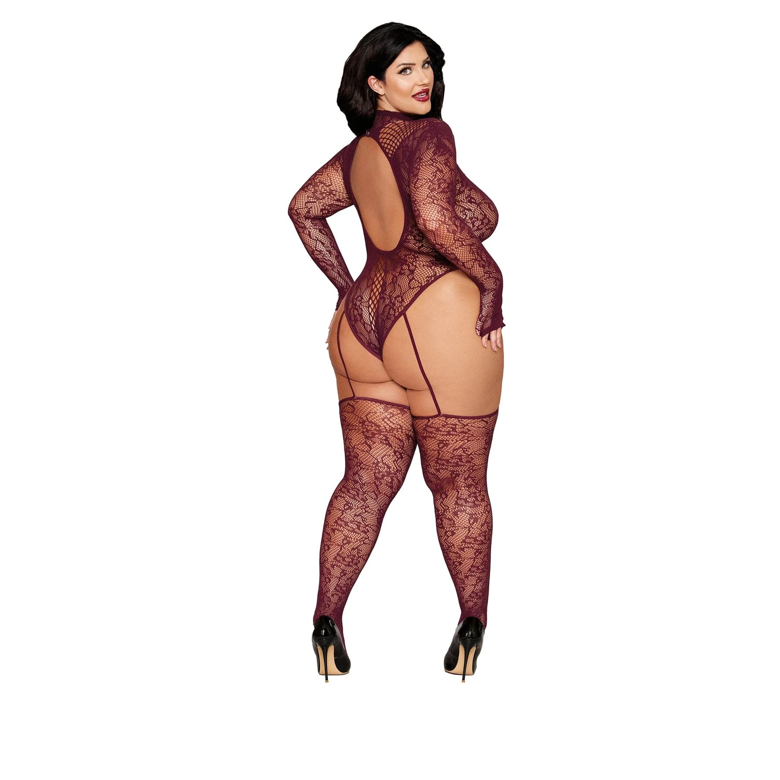 • Plunging fishnet neckline detail, long sleeves and mock turtleneck with snap closure and large open back